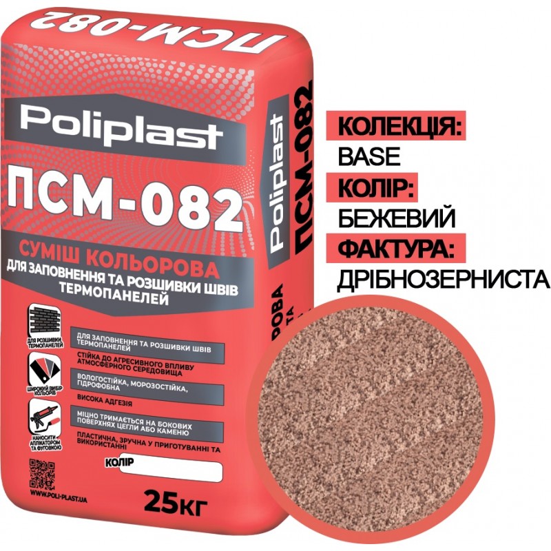 ПСМ-082 - сухая цветная смесь для заполнения и расшивки швов термопанелей и других облицовочных материалов (кладки клинкерного, керамического, силикатного лицевого кирпича, натурального и искусственного камня, облицовочной плитки и других стеновых материалов) шириной до 20 мм между облицовочными материалами внутри и снаружи помещений.