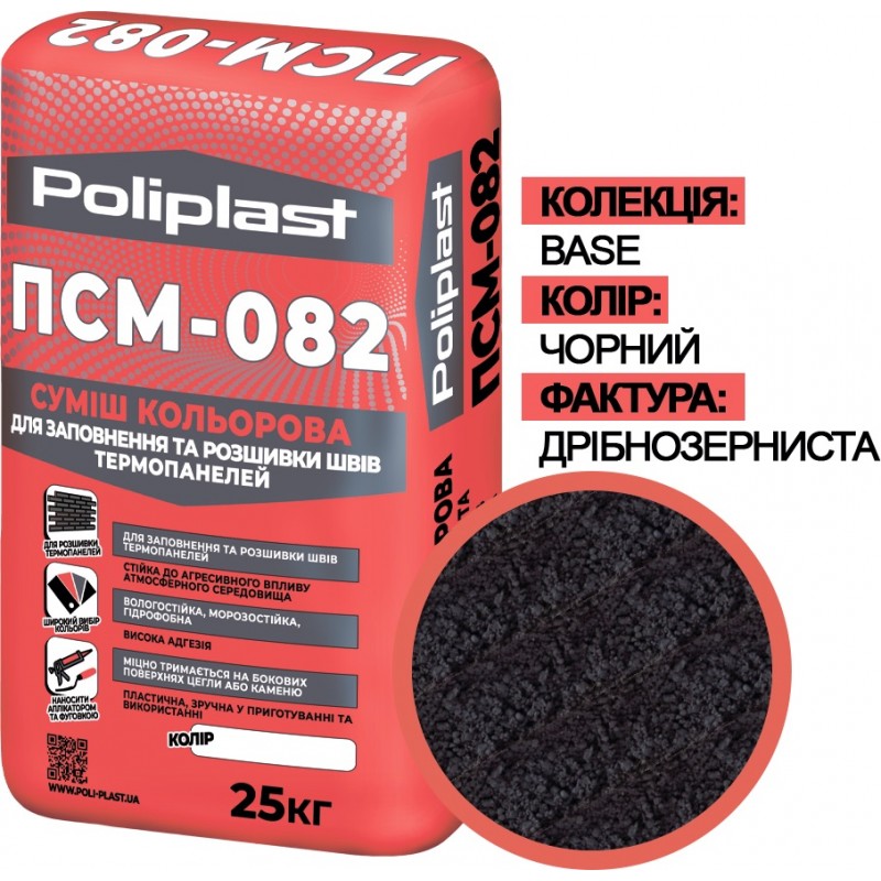 ПСМ-082 - сухая цветная смесь для заполнения и расшивки швов термопанелей и других облицовочных материалов (кладки клинкерного, керамического, силикатного лицевого кирпича, натурального и искусственного камня, облицовочной плитки и других стеновых материалов) шириной до 20 мм между облицовочными материалами внутри и снаружи помещений.