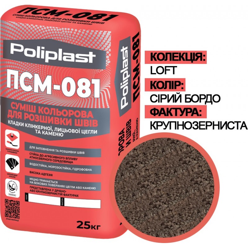 ПСМ-081 - сухая цветная смесь для заполнения и расшивки швов кладки клинкерного, керамического, силикатного лицевого кирпича, натурального и искусственного камня и других стеновых материалов внутри и снаружи помещений.