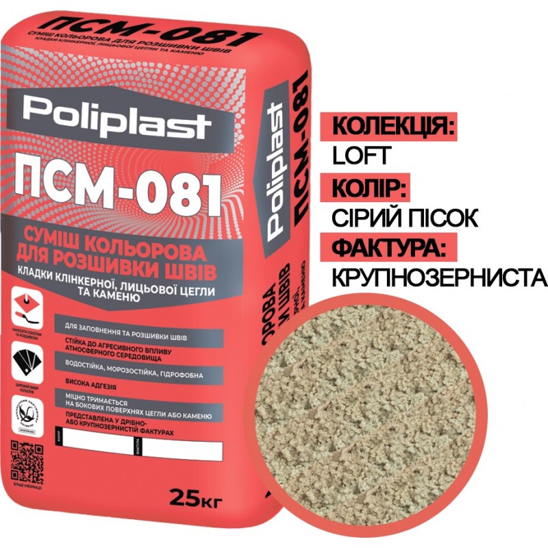 ПСМ-081 - сухая цветная смесь для заполнения и расшивки швов кладки клинкерного, керамического, силикатного лицевого кирпича, натурального и искусственного камня и других стеновых материалов внутри и снаружи помещений.
