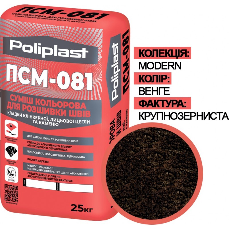 ПСМ-081 - суха кольорова суміш для заповнення та розшивки швів кладки клінкерної, керамічної, силікатної лицьової цегли, натурального та штучного каменю та інших стінових матеріалів усередині та зовні приміщень.